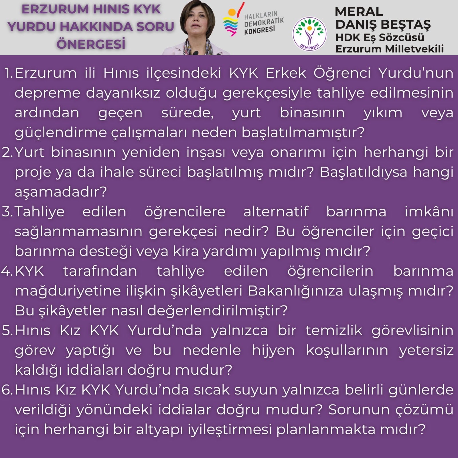 Konuya ilişkin DEM Parti Erzurum Milletvekili Meral Danış BEŞTAŞ TBBM'ye soru önergesi vererek KYK yurdunun akibeti hakkında bilgi istedi.Dem Parti Erzurum Milletvekili BEŞTAŞ yaptığı açıklamada ;"Erzurum’un Hınıs ilçesinde bulunan KYK Erkek Öğrenci Yurdu, geçtiğimiz eğitim-öğretim yılının birinci dönem sonunda “depreme dayanıklı olmadığı” gerekçesiyle tahliye edildi. Ancak aradan aylar geçmesine rağmen binada ne yıkım ne de güçlendirme çalışması başlatıldı. Öğrencilere alternatif barınma imkânı sunulmadı; gençler kendi imkânlarıyla ev kiralamak zorunda kaldı. Yüksek kira maliyetleri ve zor yaşam koşulları nedeniyle birçok öğrenci okulunu bırakmak ya da kayıt dondurmak durumunda kaldı. Yine Hınıs Kız KYK Yurdu’nda da ciddi altyapı, temizlik ve sıcak su sorunları yaşanıyor. Bazı bloklarda temizlik personeli yetersiz, sıcak suya haftada sadece üç gün erişilebiliyor. Yurdun eski YİBO binası olması ve bir kısmının hâlen fen lisesi öğrencilerine tahsis edilmesi, üniversiteli gençlerin barınma hakkını açıkça ihlal ediyor. Bu sorunların çözülmesi ve öğrencilerin barınma hakkının güvence altına alınması için TBMM’ye soru önergesi verdik."dedi.